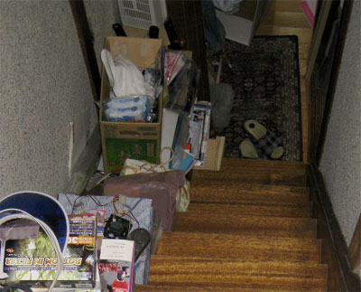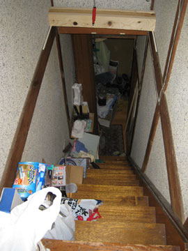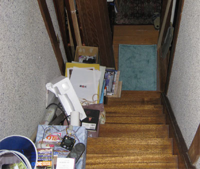階段の踊り場には籐ソファーが置いてあったんですが(そのほかに鏡とかダンボールとかとにかく山積み)