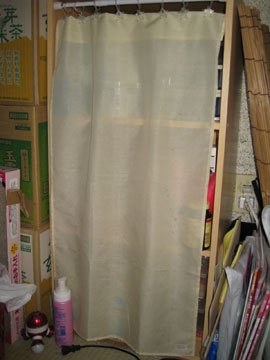 いかにもとってつけたようなカーテンで目隠ししてますが、
