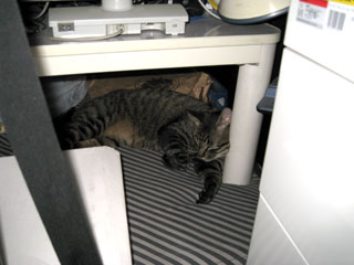ニャンはベッド独り占め中。(ベッドの上にコタツ、その他もろもろ・・・片付く日はまだまだ遠い)
